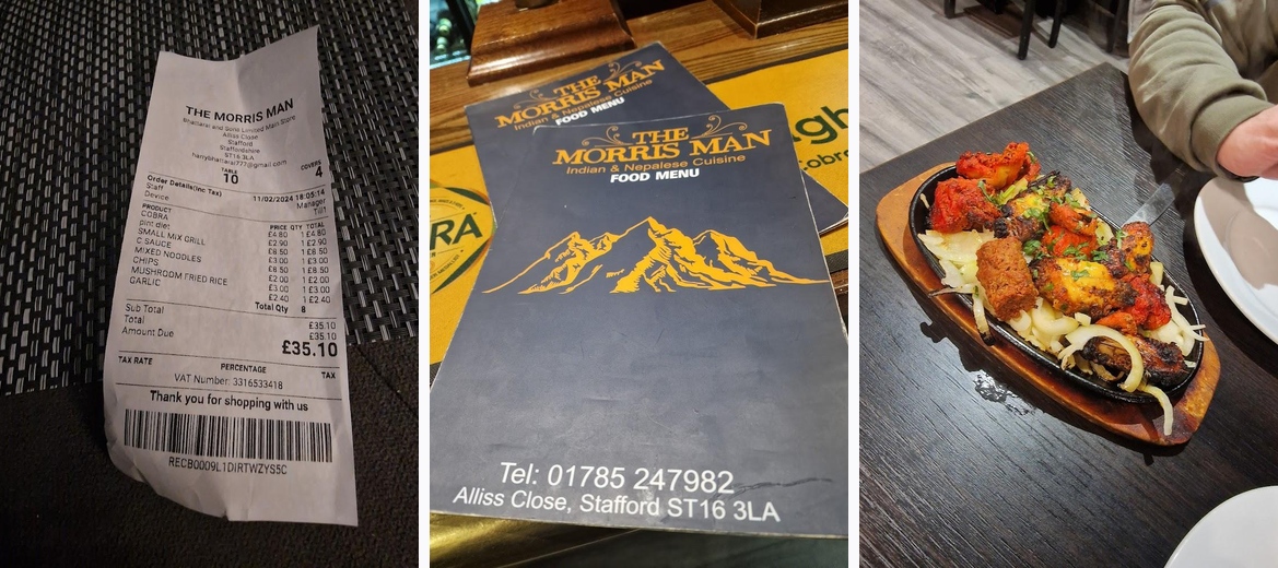 We frequented The Morris Man one evening as I had heard extremely good things about the food. Upon entering the pub, imagine my horror as I was greeted with what I can only describe as a menagerie of rowdy customers heavily intoxicated and producing a hell of a din. Luckily, upon speaking to the bar staff, it became apparent that the restaurant was in another part of the pub. (I personally would advise that this be made more apparent to people who are there to eat, as it could potentially be off-putting to prospective customers). Now, onto the food. My god.. the food. Originally hailing from The Black Country, I was lucky that these 'Indian Grill' style pubs are plentiful and a staple of the local cuisine. Now a resident of North Staffordshire, I have strived to discover a place I can regularly visit for good Indian Food. After 4 years of searching, I have finally found it. On the good recommendation, I wanted to sample the mixed grill and a curry. After ordering, the food was on our table within 10 minutes, piping hot, complemented by a plethora of sauces. The mixed grill was extremely tasty and probably in my top 3 of Indian mixed grills. We had the 'Lamb Tawa Masala'.. and I am forever grateful to have ordered this. This curry is probably the best curry I have ever had outside of the 'Curry Triangle' of Birmingham in its heyday. The wife had to talk me out of storming into the kitchen like a crazed lunatic and demanding the recipe. Utterly astonishing. I 100% recommend this restaurant, and 1000% recommend the Lamb Tawa Masala as a must try. (Please can I have the recipe 😉).