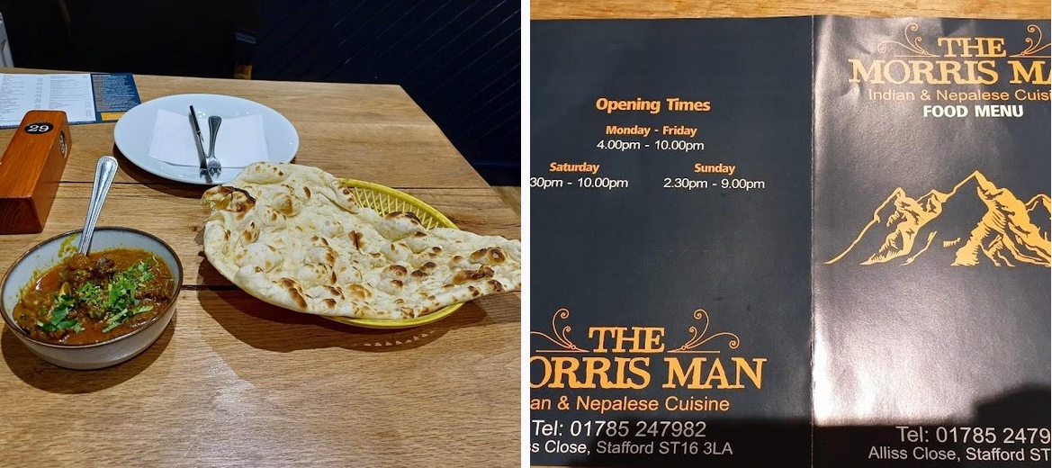 The Morris Man specializes in Indian and Nepalese cuisine, featuring a variety of curries, meat dishes, and traditional breads.